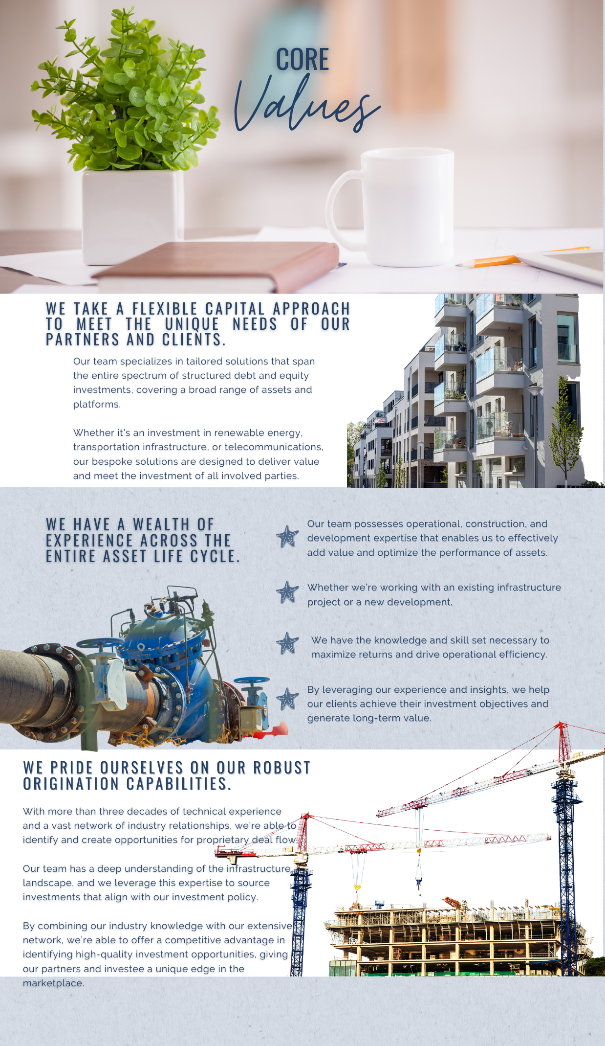 A focused strategy on the acquisition of assets with strong long-term cash-flow potential with broad Infrastructure Coverage Experience Across the Asset Lifecycle & Flexible Capital Approach. We strive for consistent and sustainable returns, all while safeguarding our portfolios against potential downside risks. Our approach to portfolio management is centered around diversification, as we invest across various sectors and geographic locations. This strategy allows us to minimize market-specific risks and achieve a higher level of stability.